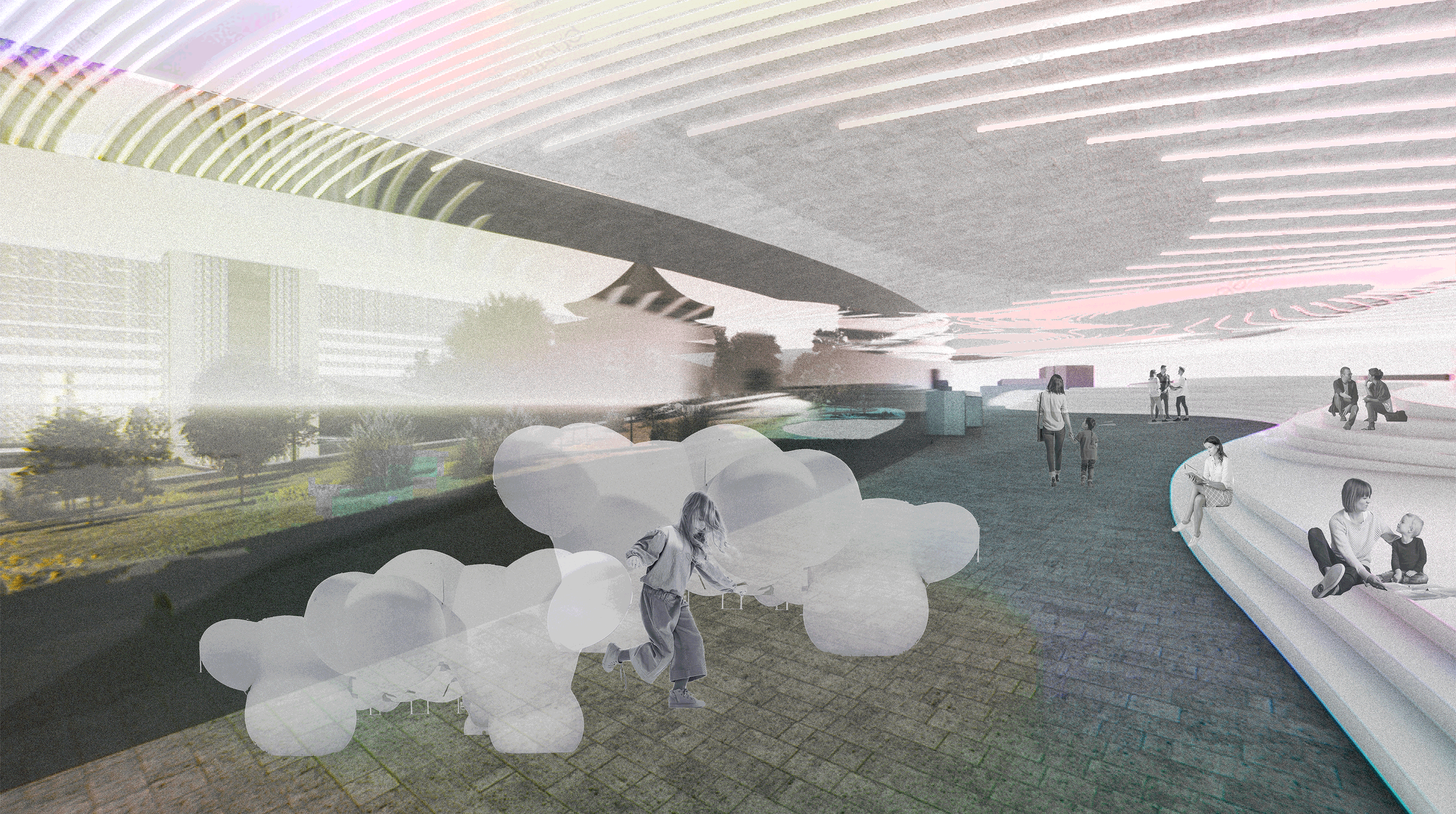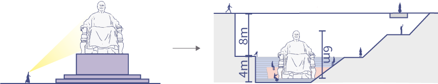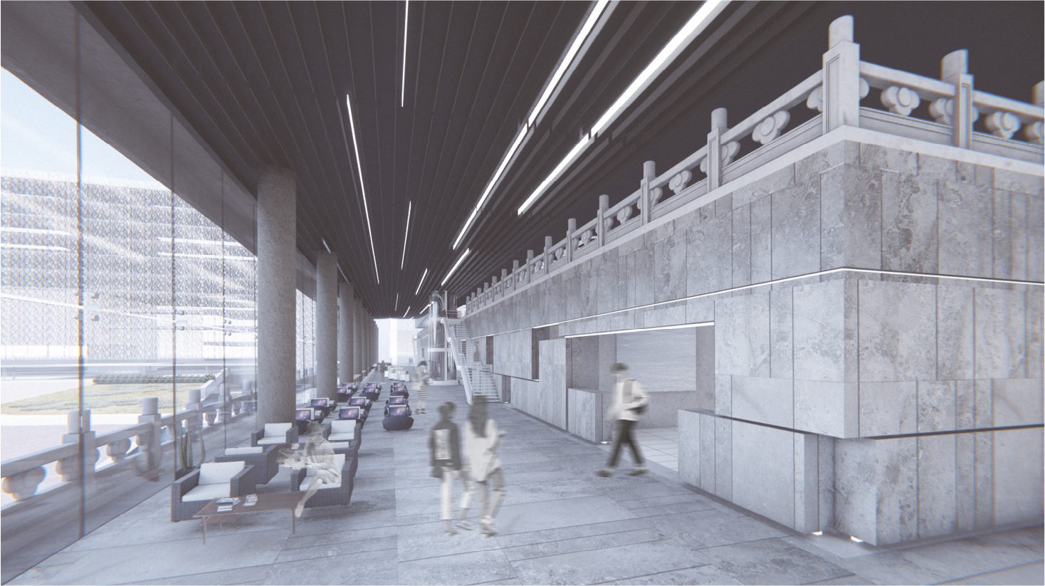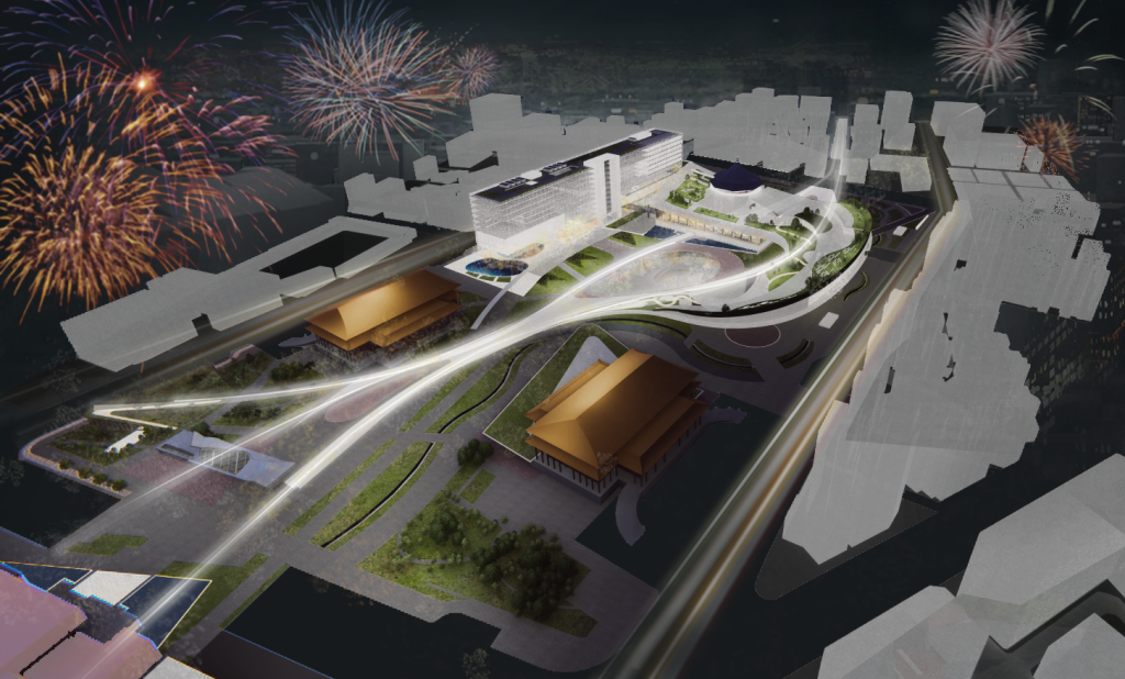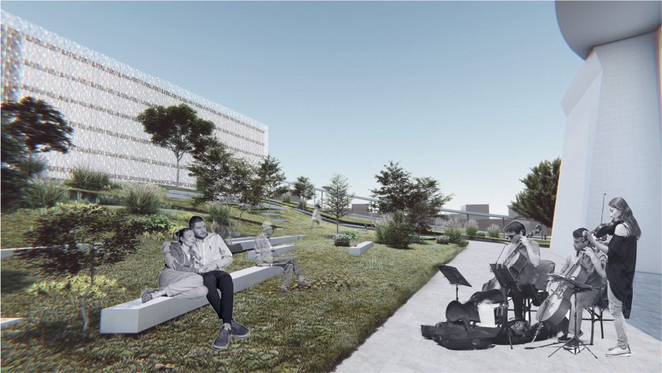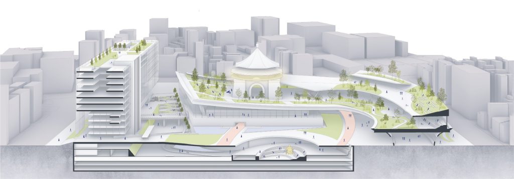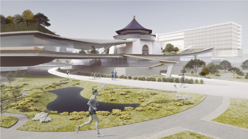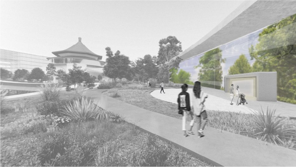 The terminus of the slope will connect to the CKS Memorial Hall, with the northern building serving as the slope’s end view. The curtain wall will reflect the natural elements and activities occurring on the slope, while also offering enhanced functionalities such as projection capabilities during events.