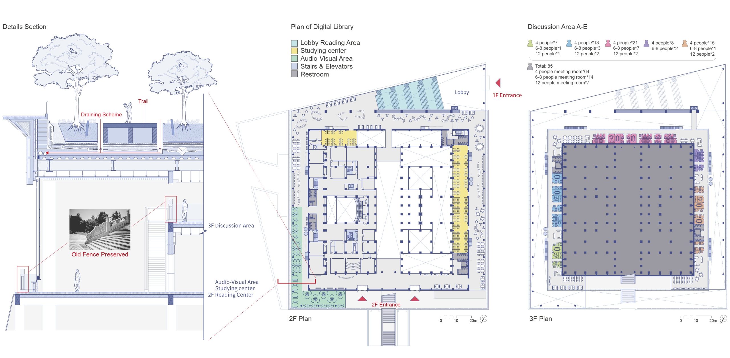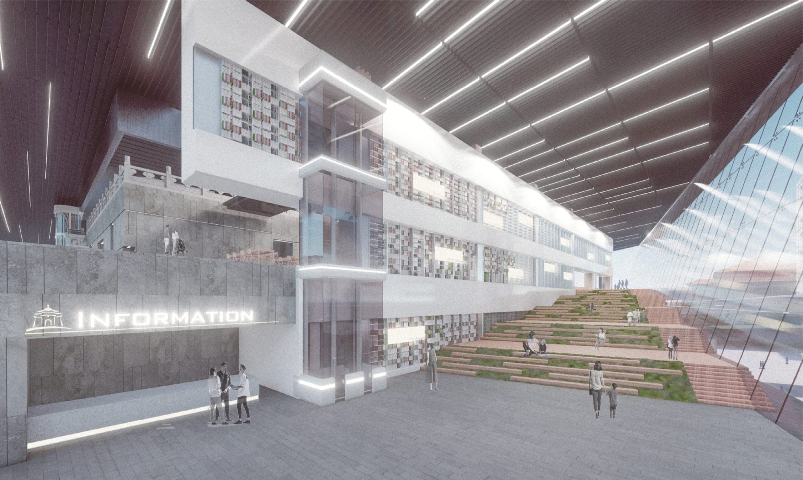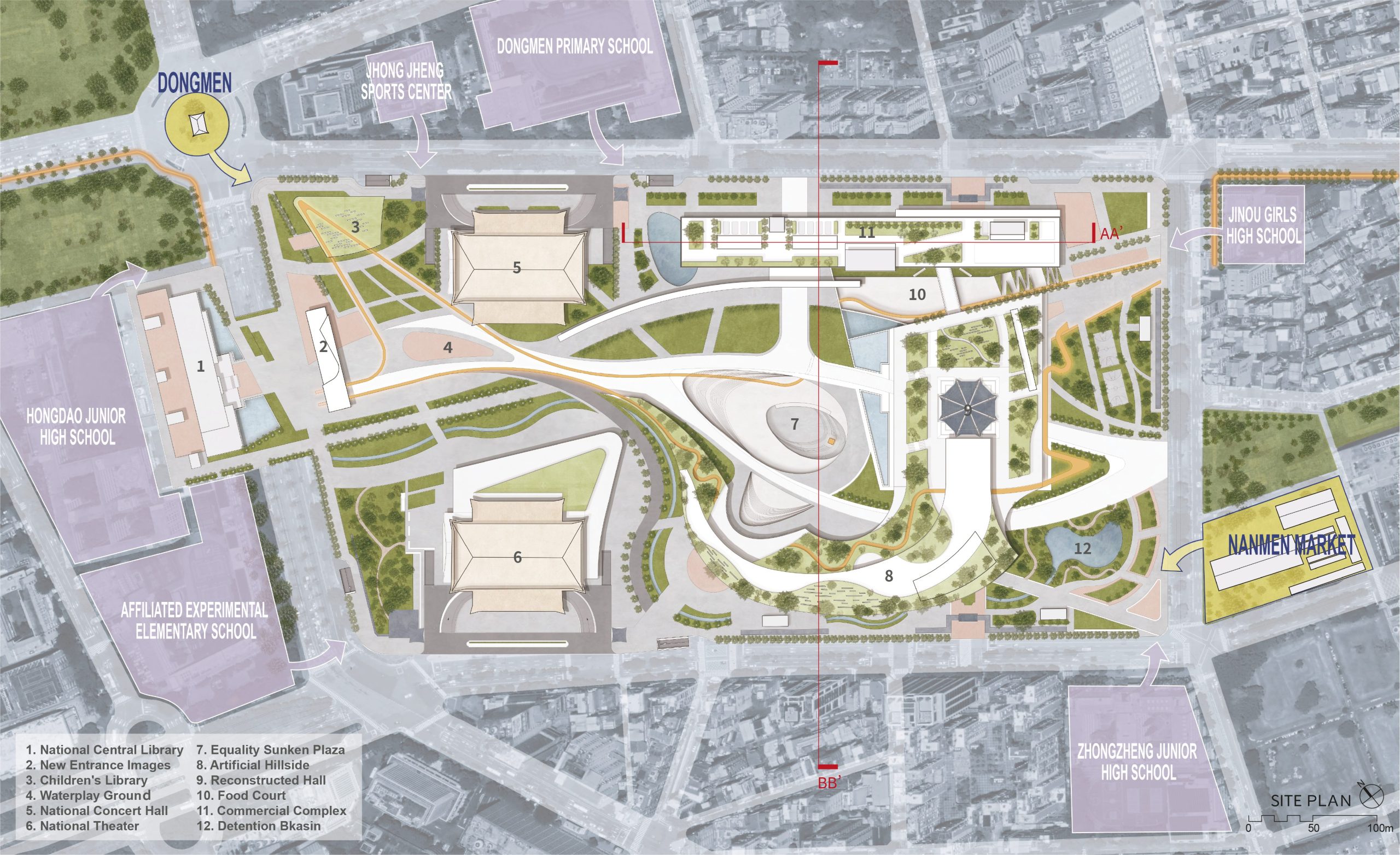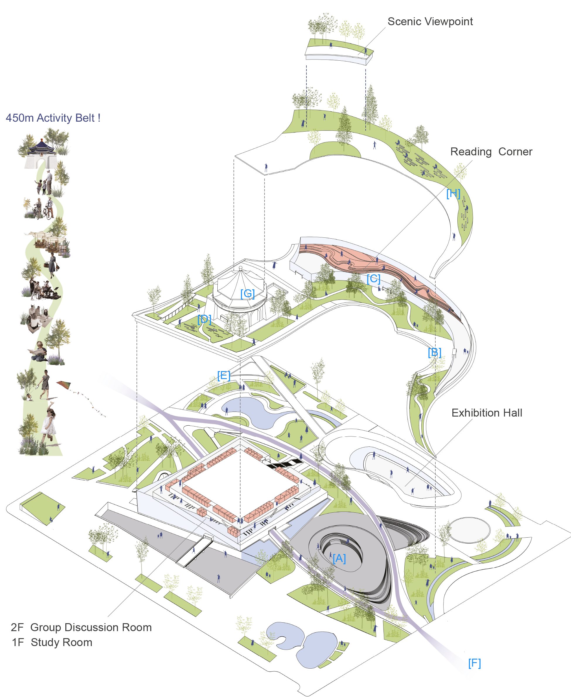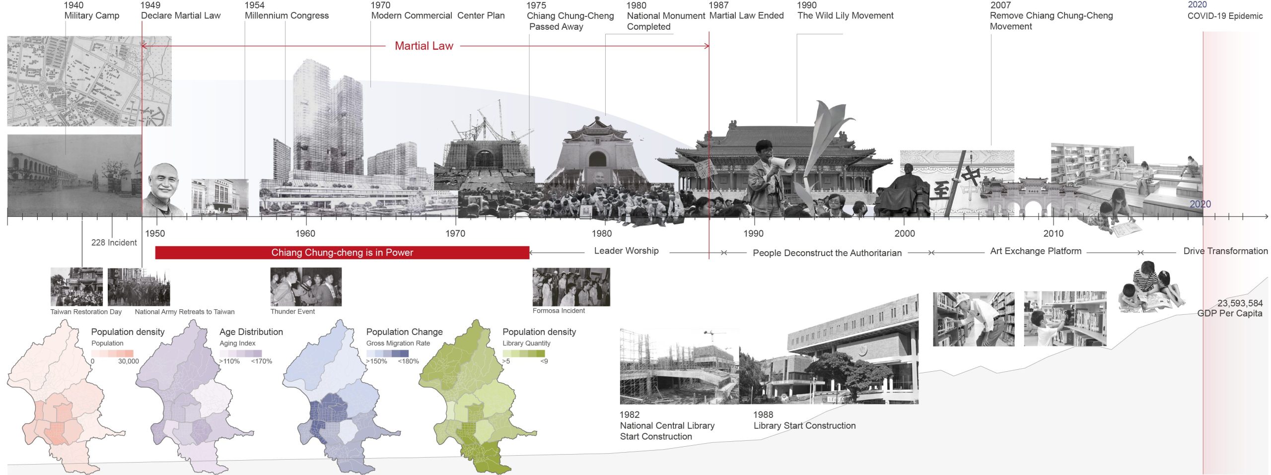 As the capital city, Taipei boasts the highest population density in Taiwan, accompanied by the smallest per capita living area in the nation, yet the population continues to grow. In response, through contextual mapping of Taipei City, we have decided to designate this area as a Library Memorial Park, serving as a new urban living room for the citizens of Taipei. We believe that literature, humanities, and intelligence can dissolve historical animosities, bringing a renewed image to this location.