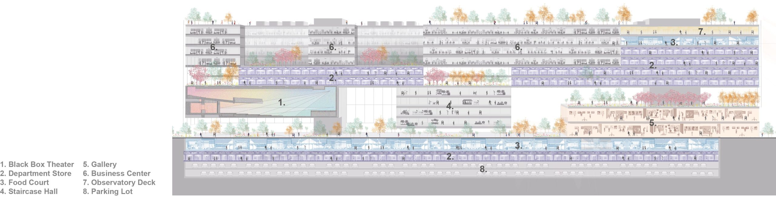 I aim to rejuvenate this area through integrating a shopping mall, office spaces, a sunken plaza, galleries, a food boulevard, and a mid-sized theater. By creating voids at the base level of the commercial complex, a microclimate can be established, preventing ground-level congestion and offering the city a green corridor.