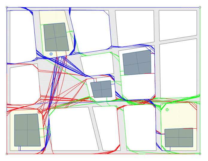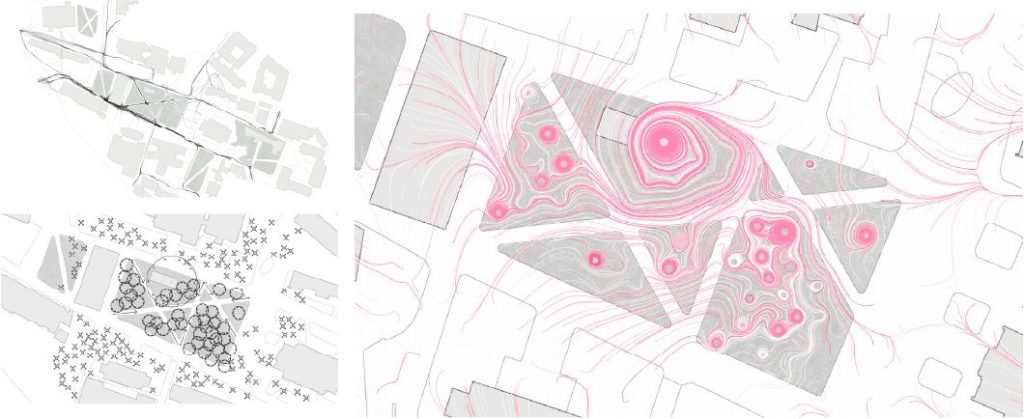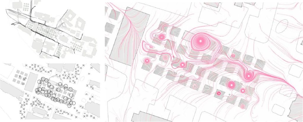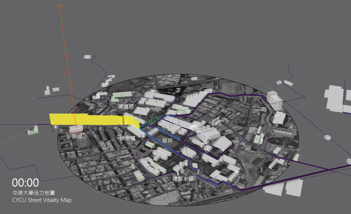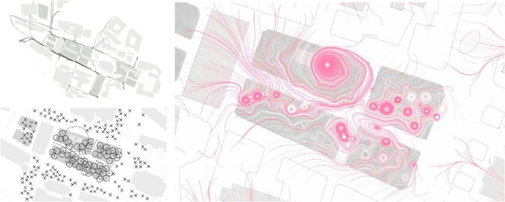 Following the typology and pedestrian flow simulation phases, the results led to the subsequent inquiry: Is a standardized turf division approach suitable for CYCU? Consequently, I simulated pedestrian engagement with new varieties of lawn spaces and applied these findings to a magnetic field to generate an attraction model, seeking an organic method for turf segmentation.