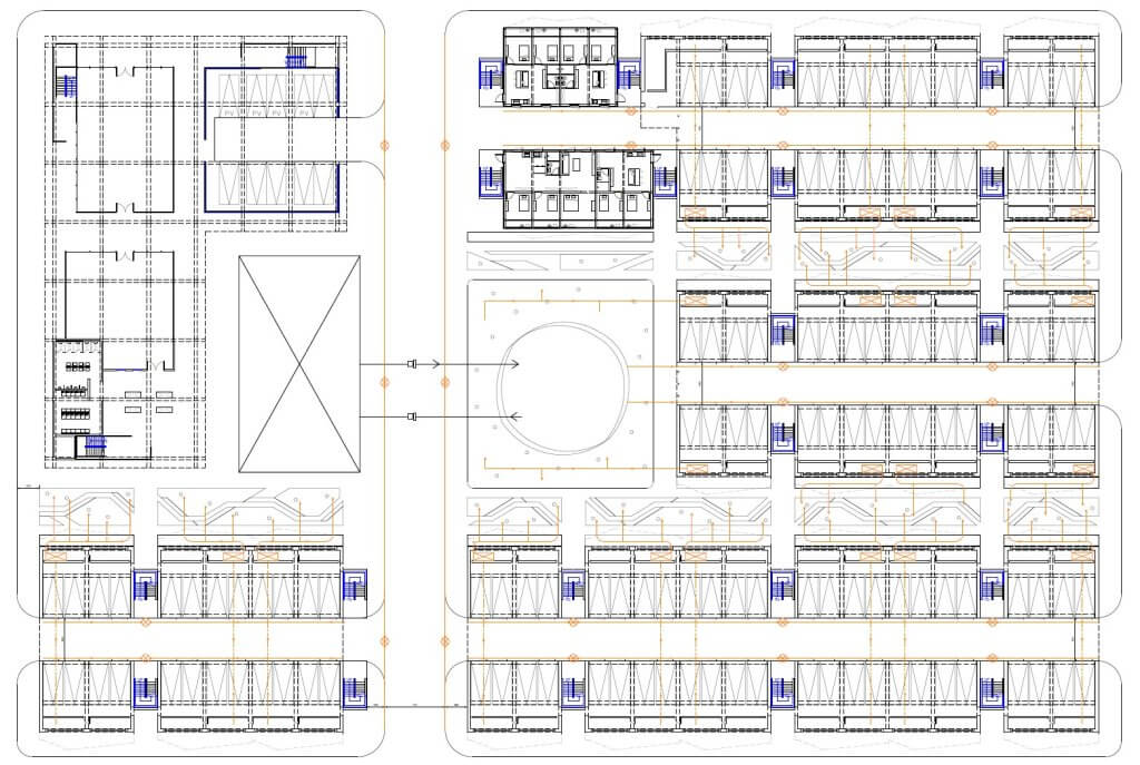 In order to achieve the needs of functional land use. We focus on reducing the excavation area of the base and maintain the water permeability of the base as much as possible to reduce interference in the base. We believe that the traffic flow in the base should be minimized, and the parking lot should be designed as a three-dimensional building base to reach a target of the ” Walking Community “. We provide a community public sky corridor and a landscaped green corridor with a landscape function that can control the ” Microclimate Factor “. Through the application of drip irrigation technology and the planting of drought-tolerant shrubs, arranged with the overhang of the building, the evapotranspiration rate caused by the sunshine and heat of the base is reduced. Let the base have more space, which can be used as a base permeable square, and can also get the use of environmental afforestation.
